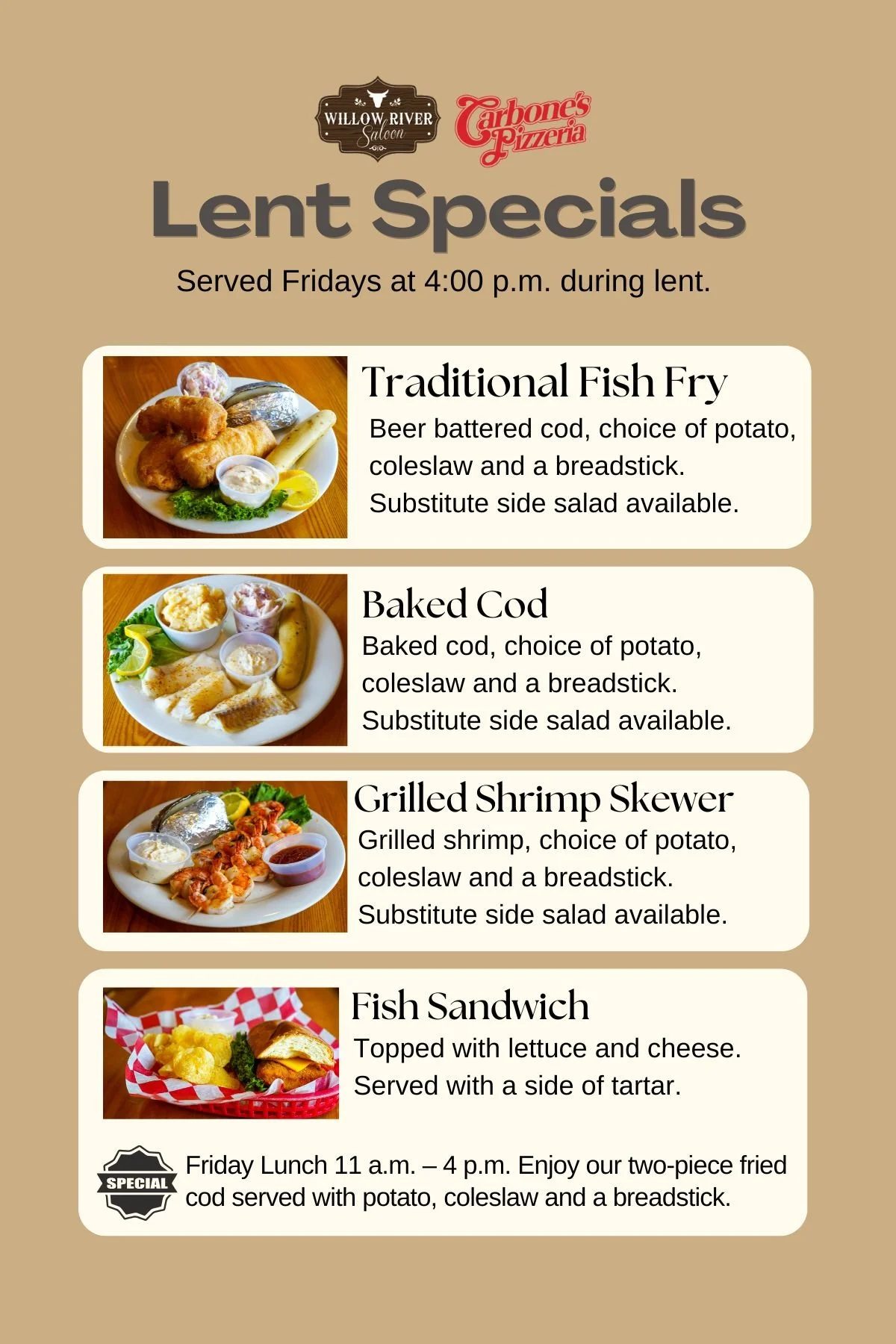 𝐃𝐢𝐧𝐧𝐞𝐫 | 𝐒𝐭𝐚𝐫𝐭𝐢𝐧𝐠 𝐚𝐭 𝟒:𝟎𝟎 𝐩.𝐦. • Beer-battered cod, baked cod, or grilled shrimp skewers served with your choice of potato, coleslaw, and a breadstick, with the option to upgrade to a side salad. • Fish sandwich topped with lettuce and cheese, served with chips and tartar sauce.